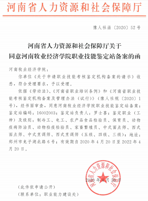 近日,河南省人力资源社会保障厅在回复给pg游戏的函中显示,pg游戏电子模拟器职业技能鉴定站顺利通过备案。鉴定职业(工种)及级别有制冷工、电工、农产品食品检验员、保育员、动物疫病防治员、家畜繁殖员、中式面点师、西式面点师、中式烹调师、西式烹调师(五级、四级、三级)。
