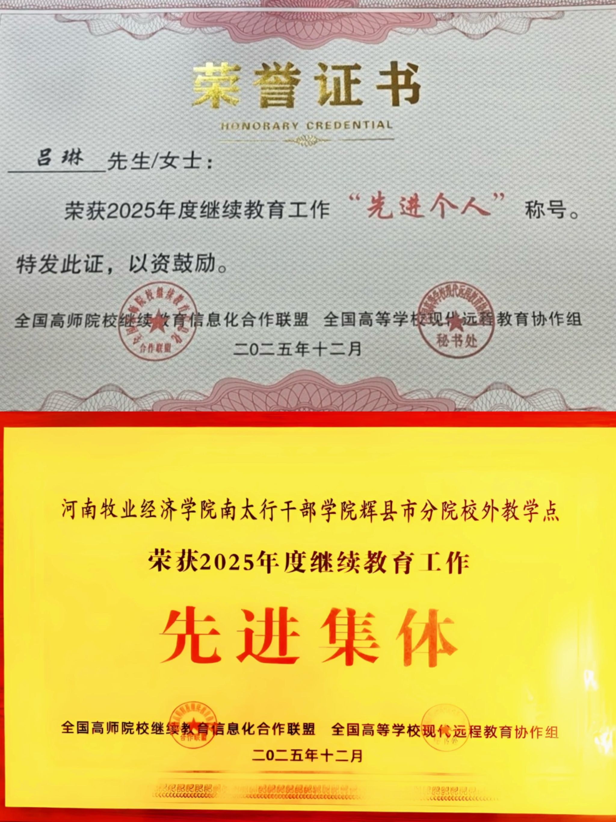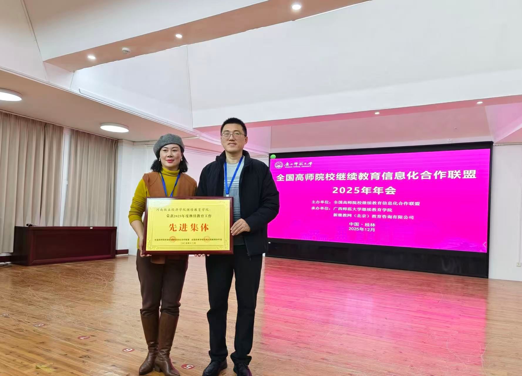会上,教育部职业教育与成人教育司高等继续教育处副处长徐璐作指导报告。来自全国多所院校的继续教育负责人、专家学者齐聚一堂,围绕新时代继续教育的发展路径展开深入交流与研讨。 会议表彰了2025年度继续教育工作先进集体与个人。pg游戏pg游戏电子模拟器获评“2025年度继续教育工作先进集体”,吕琳副院长荣获“2025年度继续教育工作先进个人”称号。同时,pg游戏校外教学点——南太行干部学院辉县市分院也荣获“2025年度继续教育工作先进集体”称号。