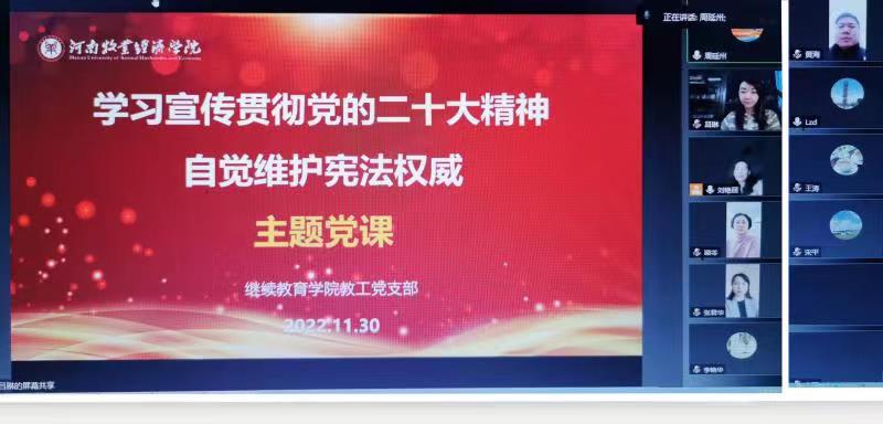 为认真学习宣传贯彻党的二十大精神,深入学习贯彻习近平法治思想,弘扬宪法精神,维护宪法权威,扎实推进宪法学习宣传和贯彻实施工作,11月30日下午,pg游戏电子模拟器教工党支部以腾讯视频会议形式开展了“学习宣传贯彻党的二十大精神 自觉维护宪法权威”主题党课学习活动,会议由教工党支部书记吕琳主持,支部全体党员参加。